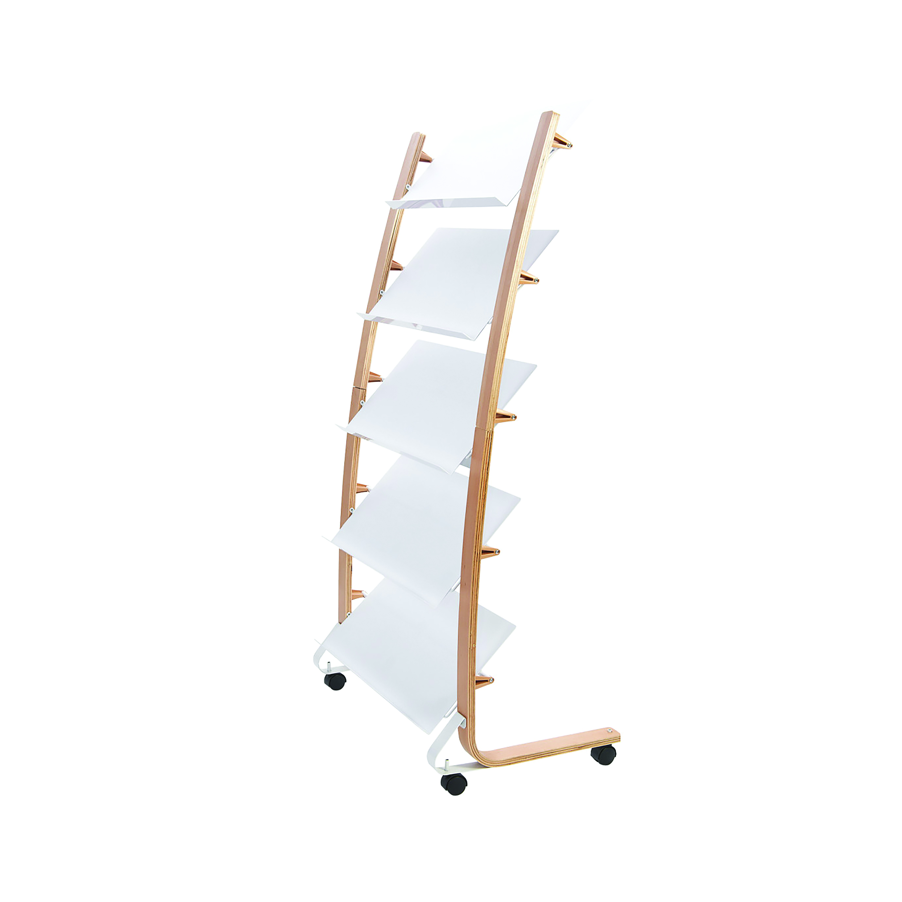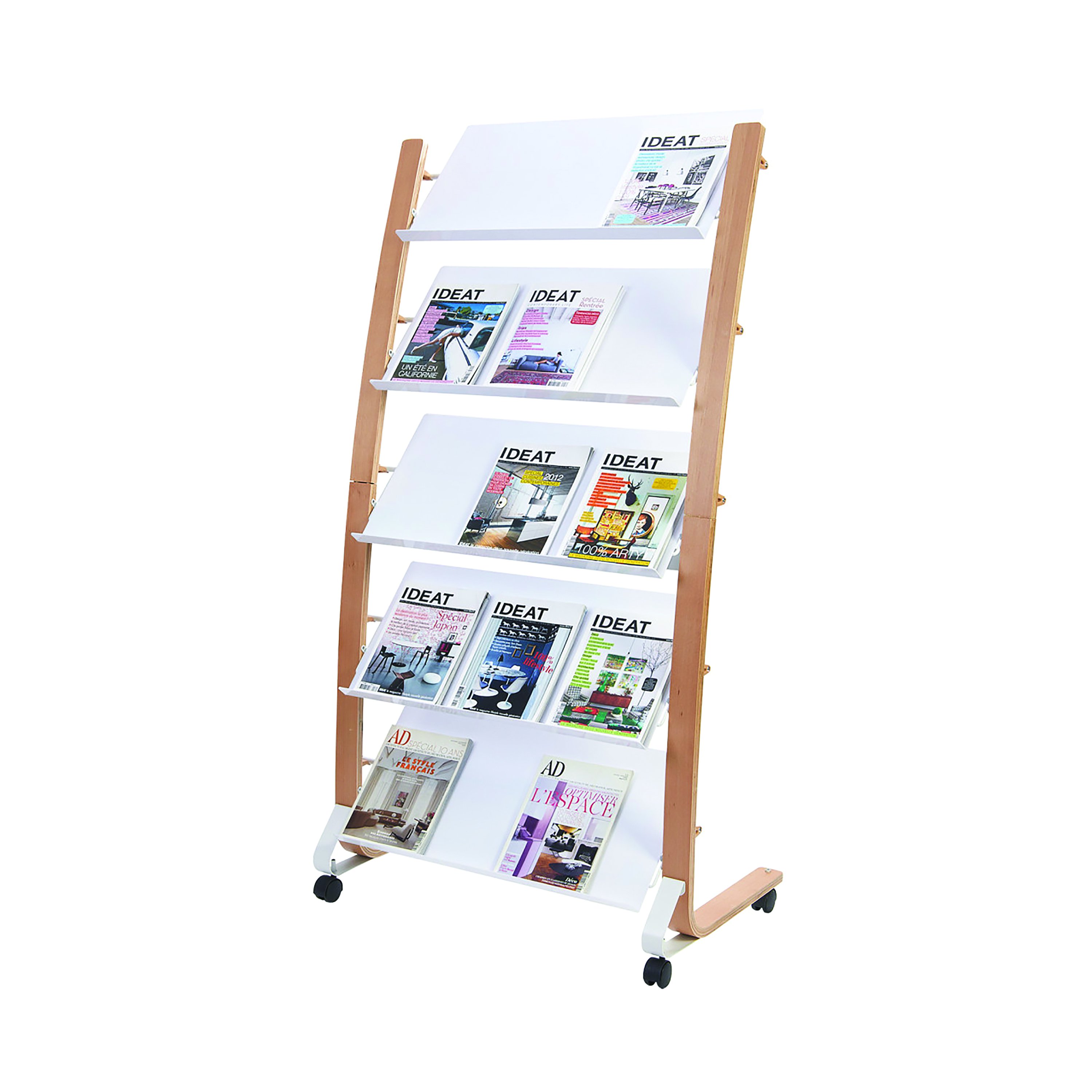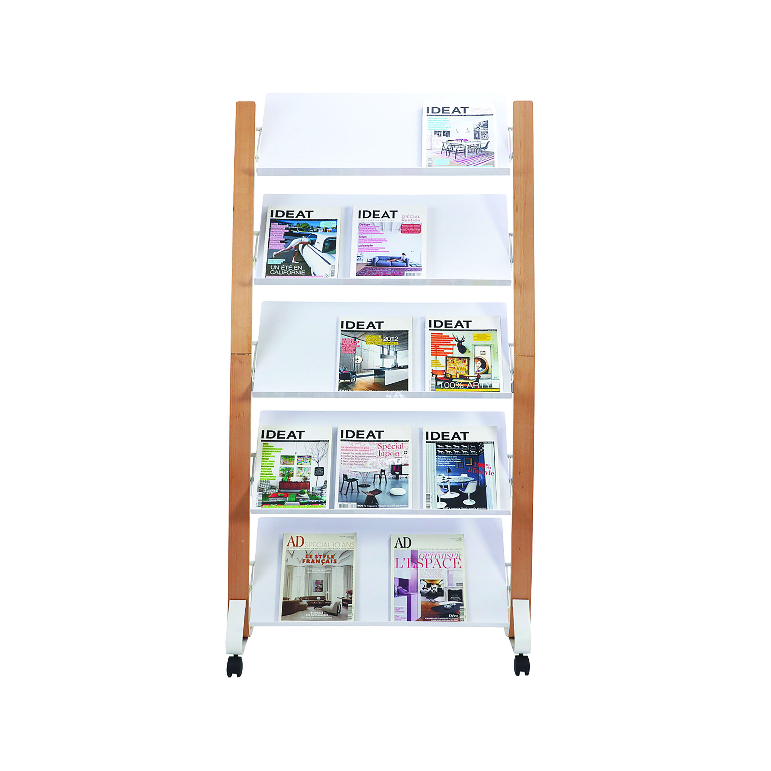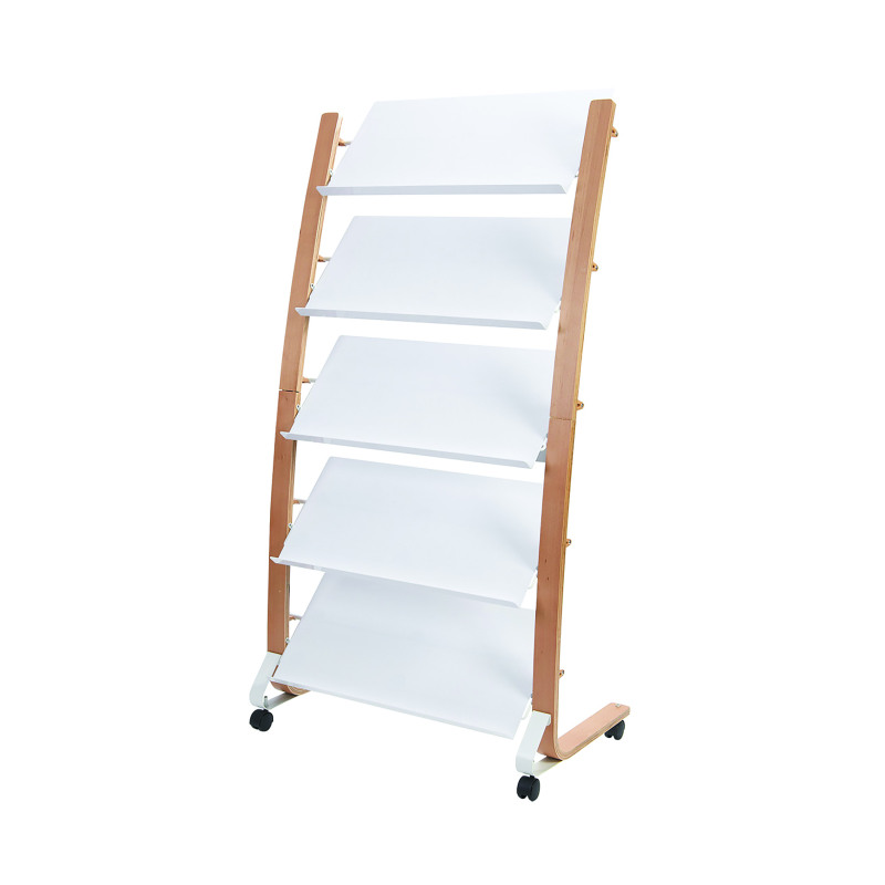 The modern and stylish display stand on wheels is the ideal solution for stylishly displaying magazines or brochures in your reception area. With its 5 compartments, each 4cm deep, you will be able to display a wide range of document sizes and formats. With its robustness and durability, the wooden document display stand is designed to stand the test of time.