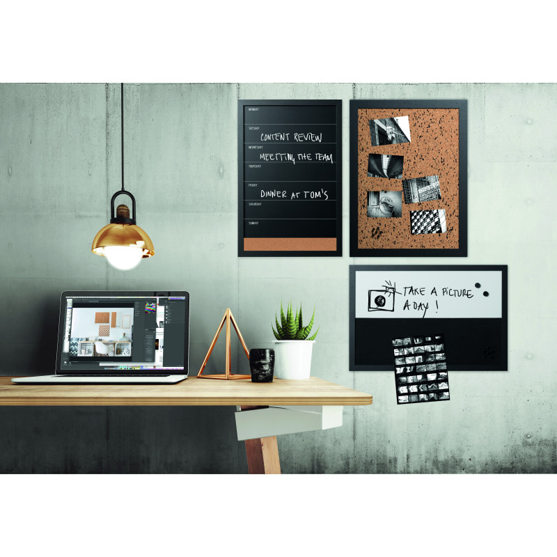 - Includes one notice board featuring a smooth black and natural cork texture surface, one weekly planner chalkboard and cork combo; and a magnetic dry erase/cork combination board
